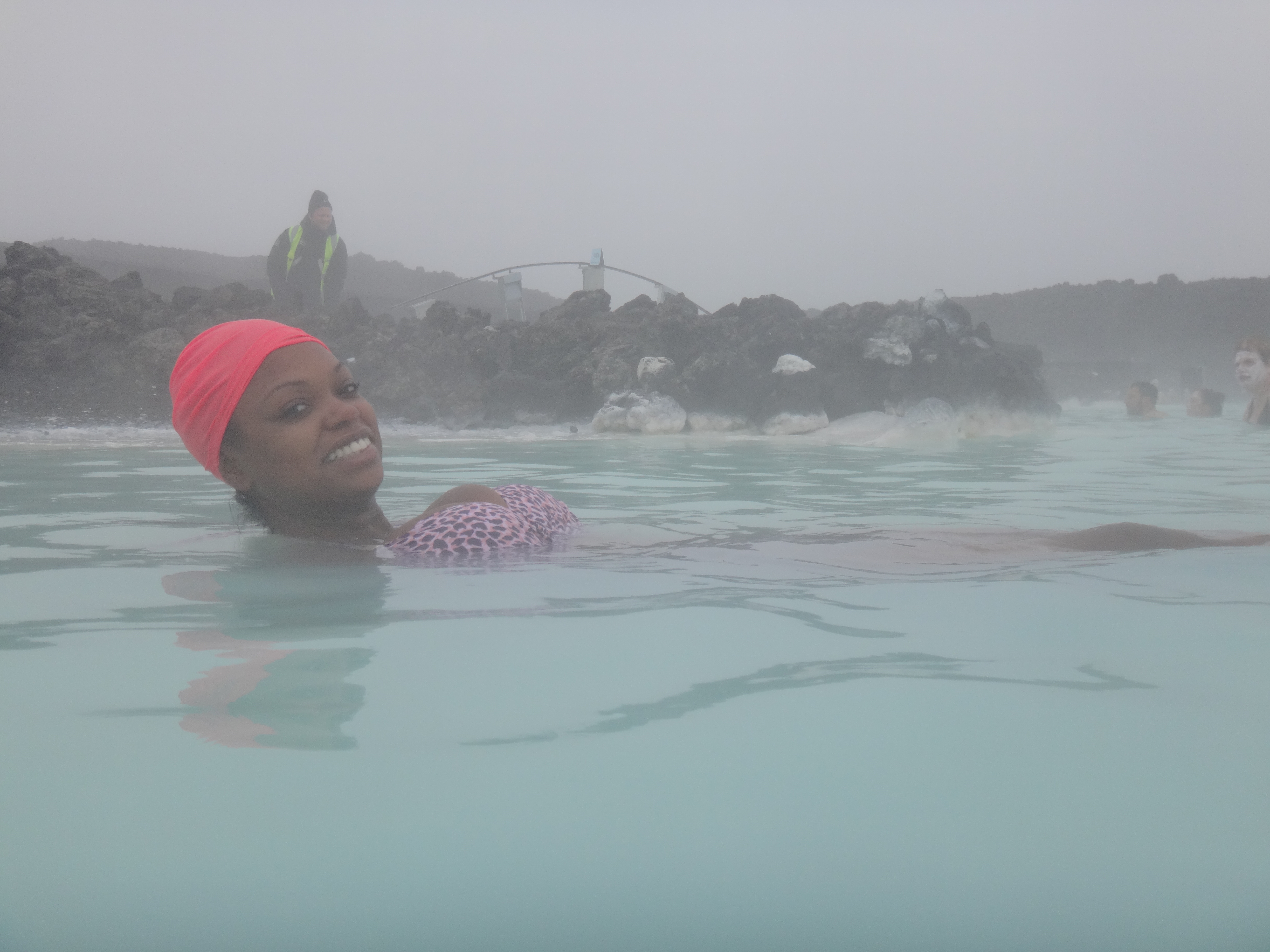 The first stop on today’s itinerary was the Blue Lagoon. Christine was coming in early that morning so we arranged to just meet at the Blue Lagoon. After checking the luggage at the front (in a small building before the main building), we headed into the main building to check in… where we were met by a pretty long line. We quickly figured out that since we had purchased the Premium Pass ahead of time, we could go on a much shorter line. After receiving our goodies (free skin care trial pack, robe, towel, and slippers), we headed to the locker room to change. Please note that you will have to shower before you go into the Blue Lagoon and some showers don’t have any doors… so if you are shy, I would advise waiting for a shower with a door. After showering and putting on our swimsuits, we finally got in to the lagoon. The hard part was getting from the building to the water because it was only 50 degrees outside (hence the bathrobe!). However, after we did make the mad dash for the water, the water was sooo hot but felt so good!