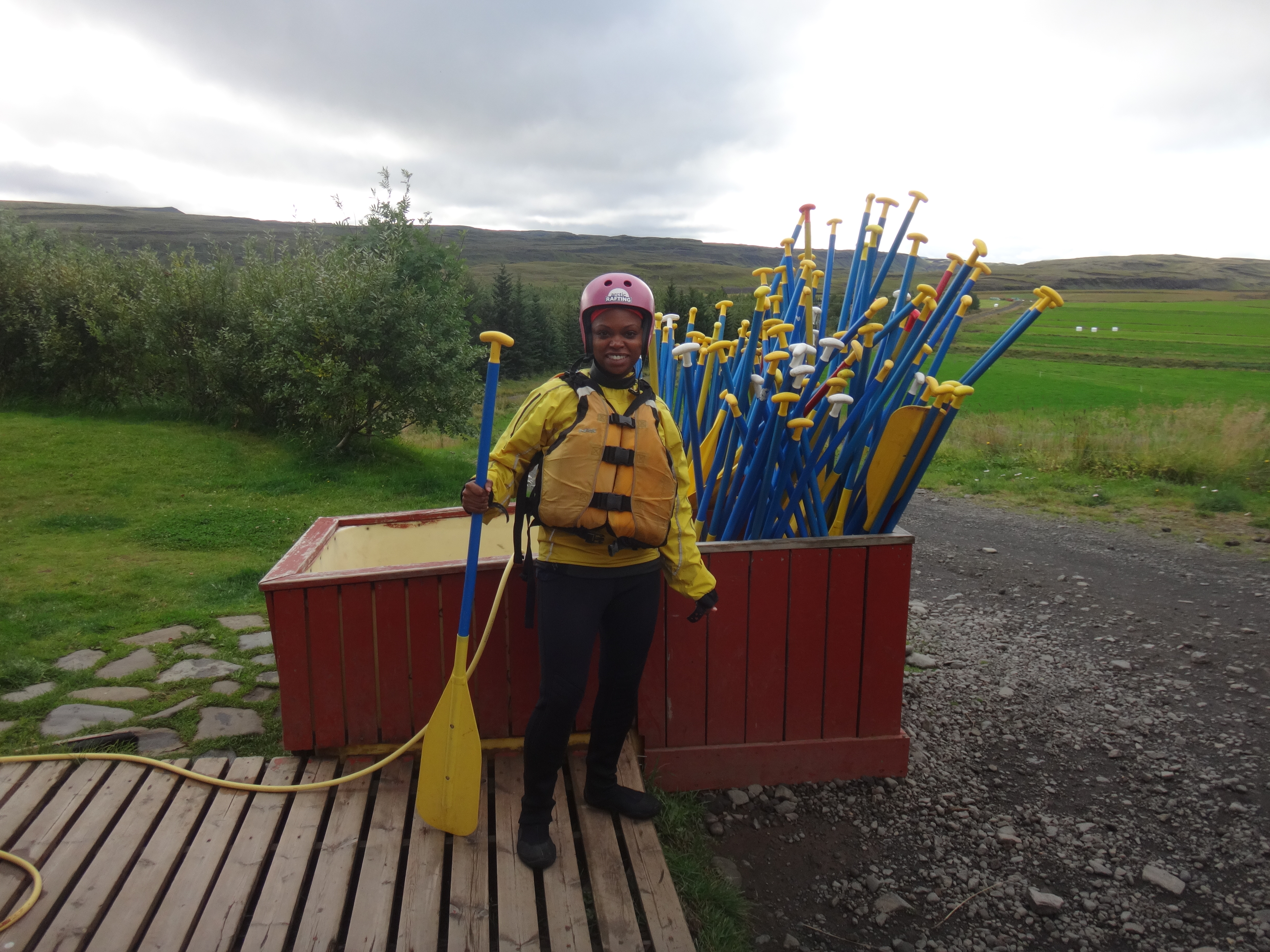 Christine left early this morning for her flight and I got ready for my river rafting tour which was about an hour drive from the city. Once we got to the base, we geared up (wetsuit, fleece, booties, jacket, helmet and oar – and yes, everything was wet and freezing even BEFORE we got in the water) and then headed on a school bus for about 20 minutes to the Hvita river. After a brief safety demonstration, we were ready to go. The rapids were about level 1 so nothing too scary but it was still fun.