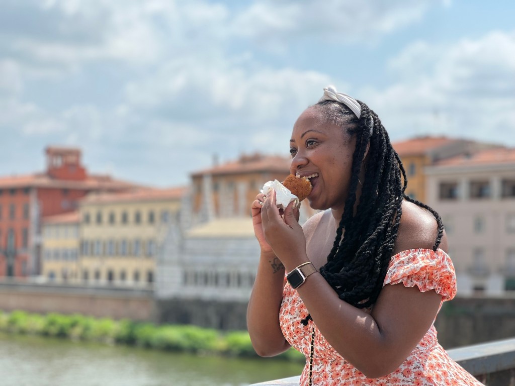 It was a leisurely 20-minute walk from the train station (Pisa Centrale) to the Leaning Tower of Pisa. We were hungry so grabbed arancini (similar to suppli) on the way.
