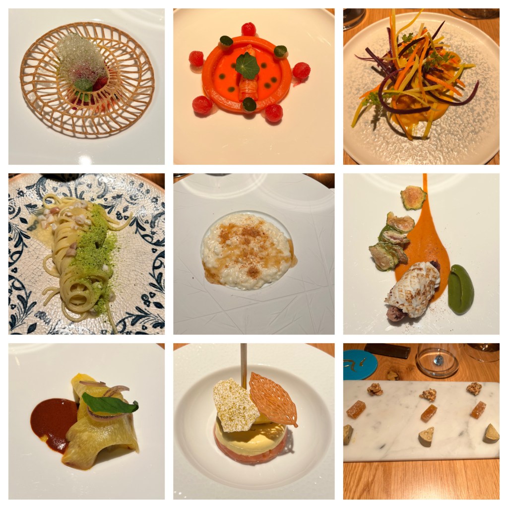 We had reservations at Almatò restaurant which wasn’t within walking distance from the hotel. Using the Free Now app which is only available in certain cities in Italy (and is similar to Uber but Uber was actually more expensive), we booked a taxi to the restaurant. We had pre-booked the 7-course tasting menu for 100 euros and I was excited to see what they would bring out. The first course was an assortment of bite-sized items, including something that tasted like a tomato. Next was a kombucha shot; then something that was a play on bruschetta; followed by a gazpacho with watermelon and shrimp (which was soooo good); then a carrot salad thingy; a spaghetti with razor clams and yuzu; a risotto with dried beef; zucchini chips with a sausage wrapped in squid; pork with pineapple; mango mousse ice cream with a biscuit and some kind of fruit at the bottom; feta in some sort of marmalade (my least favorite); and lastly, a trio of little bites of banana cheese, an apricot gummy thing, and a nutty crisp thingy. I definitely lost count and would guess it was more than seven courses, but it was an unforgettable, amazing experience and I would highly recommend it! In true European fashion, we actually ended up closing down the restaurant after spending 3 1/2 hours enjoying our dinner.