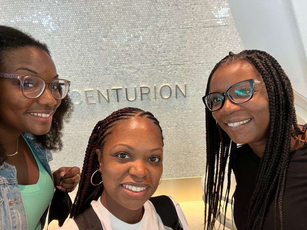 Fast forward to the day of departure: With airlines losing luggage left and right, I made sure to put AirTags (i.e., a tracking device) in my checked bag so I could locate it if it was lost. Also, I made sure to arrive at the airport three hours before the flight was scheduled to depart, giving myself plenty of time to check-in and head over to the Centurion Lounge (having a platinum Amex card sure comes in handy!). I met up with my friends, Natalie and Monique, at the lounge and we indulged in some pre-flight drinks (that Johnnie Walker and ginger ale sure hit the spot!) and food (including rice, chicken, fruit, and salad) before boarding.