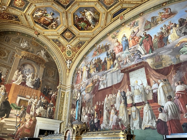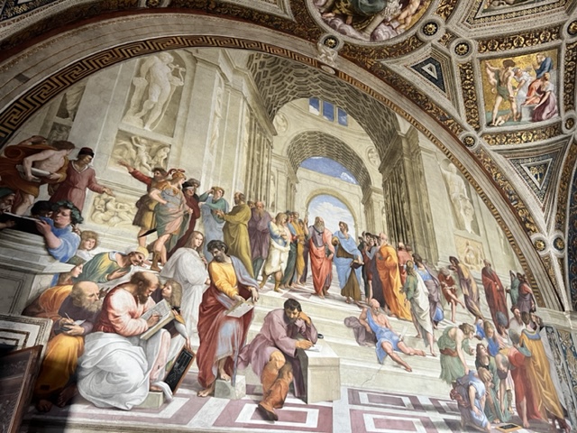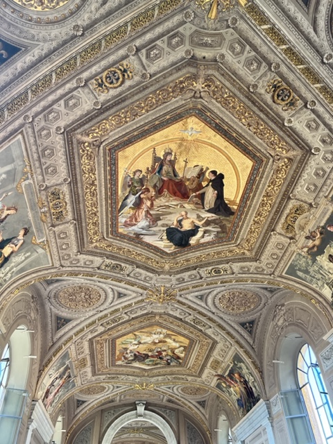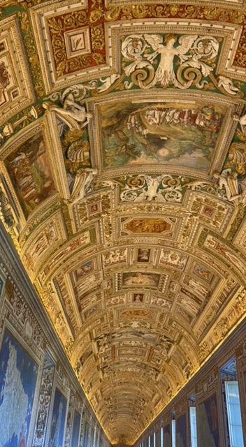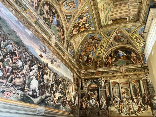 We also passed through the Gallery of Tapestries, the Gallery of Geographical Maps that had beautiful ceilings, and the Raphael Rooms (four rooms that were painted by Raphael and his pupils). Fun fact: Raphael and Michelangelo were arch enemies. Michelangelo lost several commissions to Rafael so his resentment of Raphael kept growing. Funny enough, Raphael was interested in Michelangelo’s work and even arranged a secret meeting to admire it, and was heavily influenced by it.