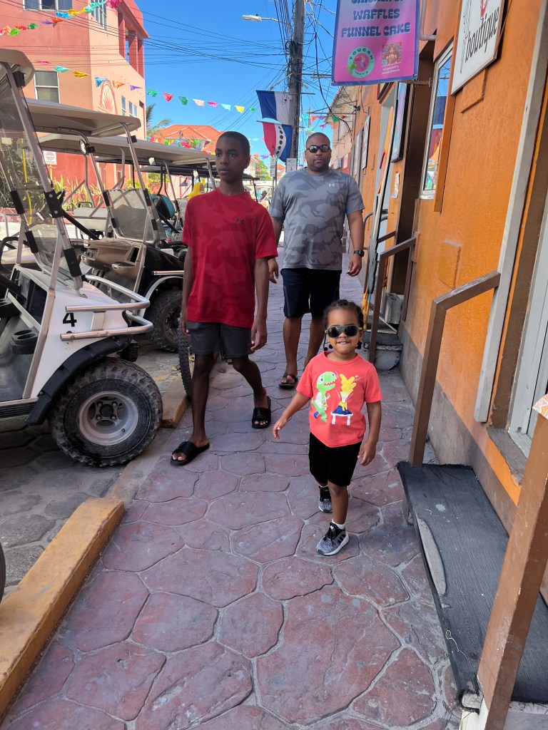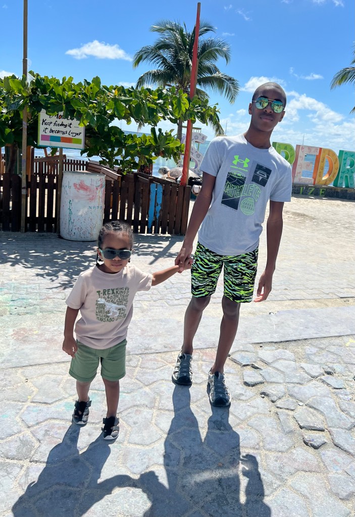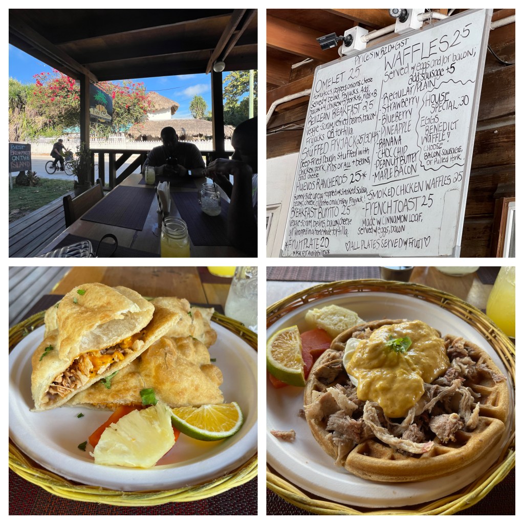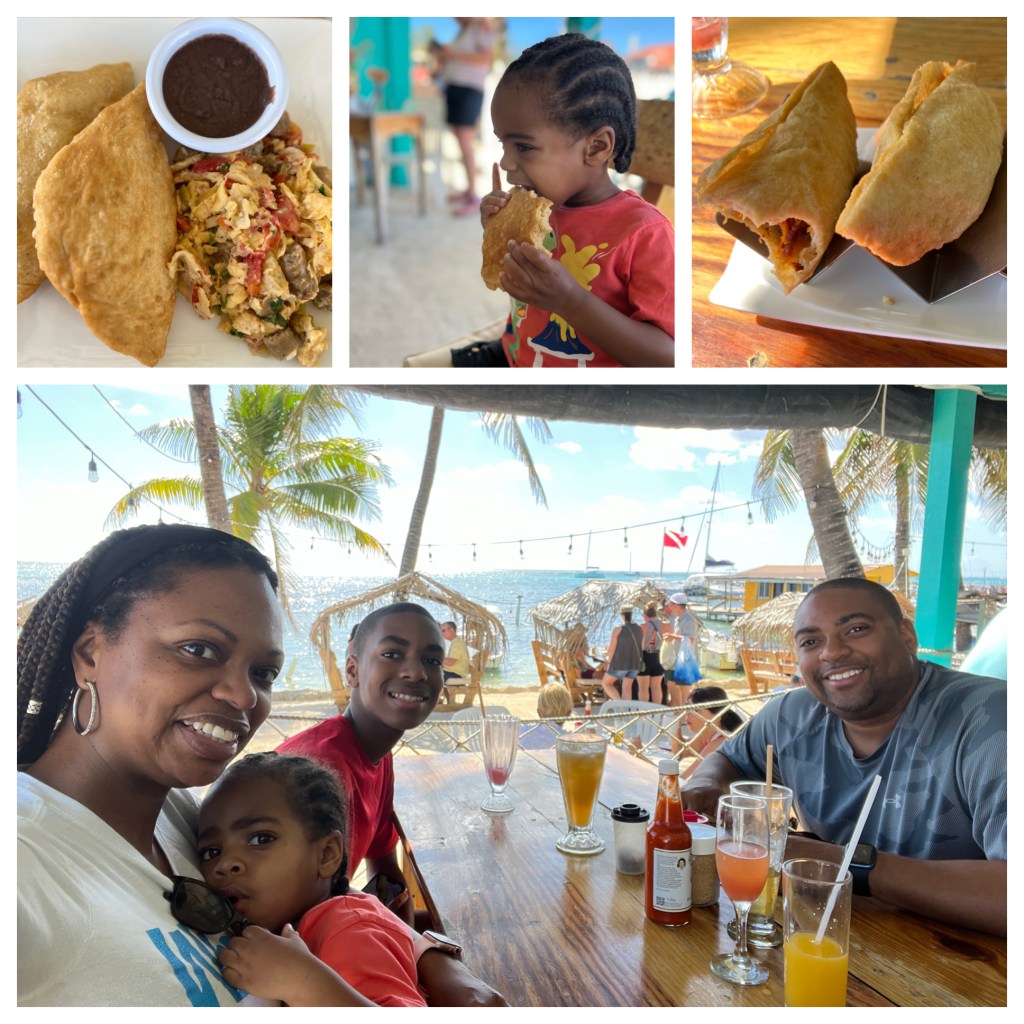 Estel’s by the Sea: We dined here for breakfast one morning and I would highly recommend it! It is located right by the water close to the water taxi dock. We were seated quickly but it gets busy, especially if you want a seat close to the water. I had the Mayan breakfast which consisted of a choice of meat (ham, bacon or sausage), eggs any style cooked with onions and peppers, and a fry jack (i.e., fried dough) along with a bean sauce. It was absolutely incredibly flavorful and filling. My oldest son Avery ordered the stuffed fry jacks which were so good that he ended up ordering another serving! My youngest son CJ had pancakes which were actually sweet enough without syrup (and as big as his head!).