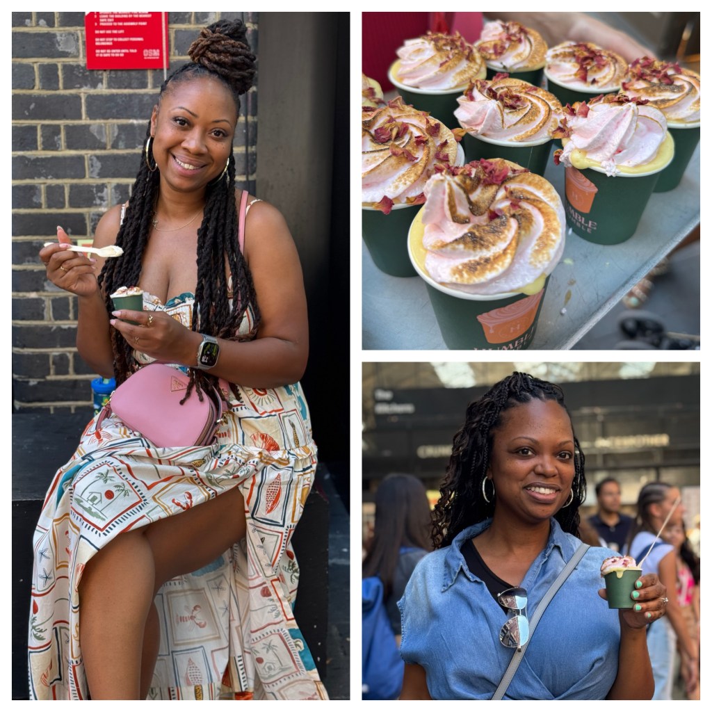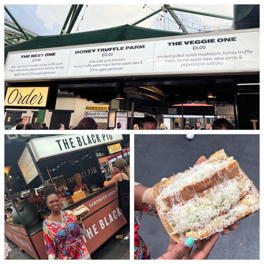 And we did it! At the market, we divided and conquered, grabbing bites from all the must-try spots: La Bomba Paella, Shellseekers Oyster Bar for fresh oysters, La Tua Pasta for burrata and truffle tortellini (living rent-free in my mind!), Bread Ahead Bakery for crème brûlée doughnuts, Turnips for black truffle risotto and fresh juices, and The Black Pig for a gourmet pork sandwich.