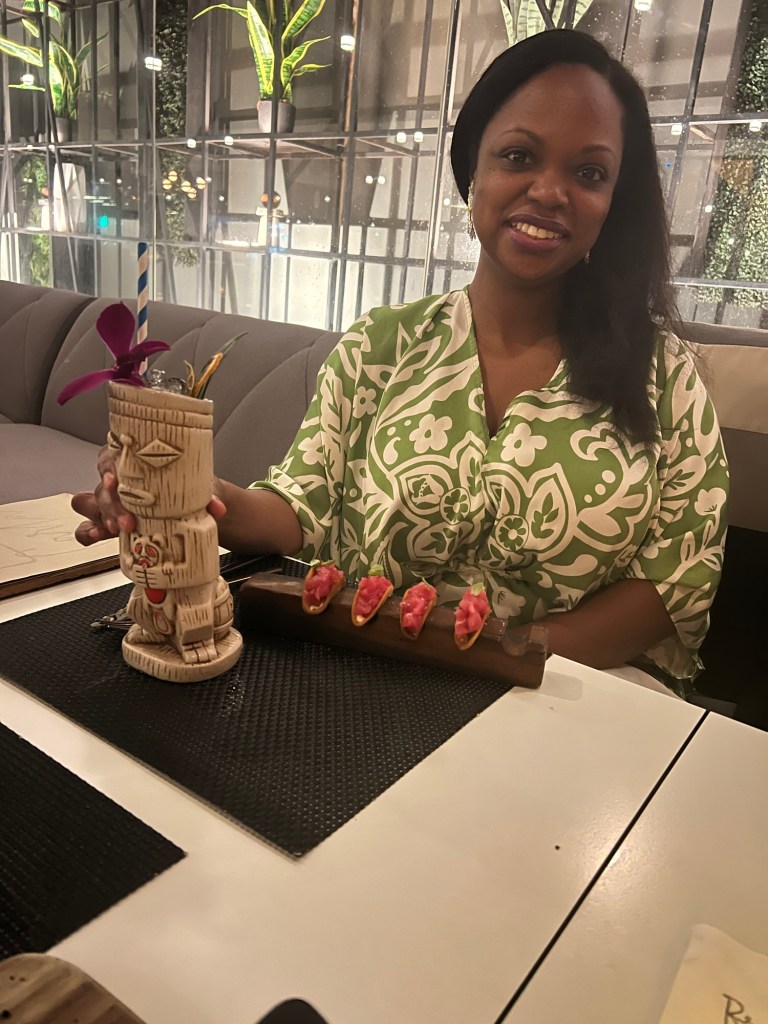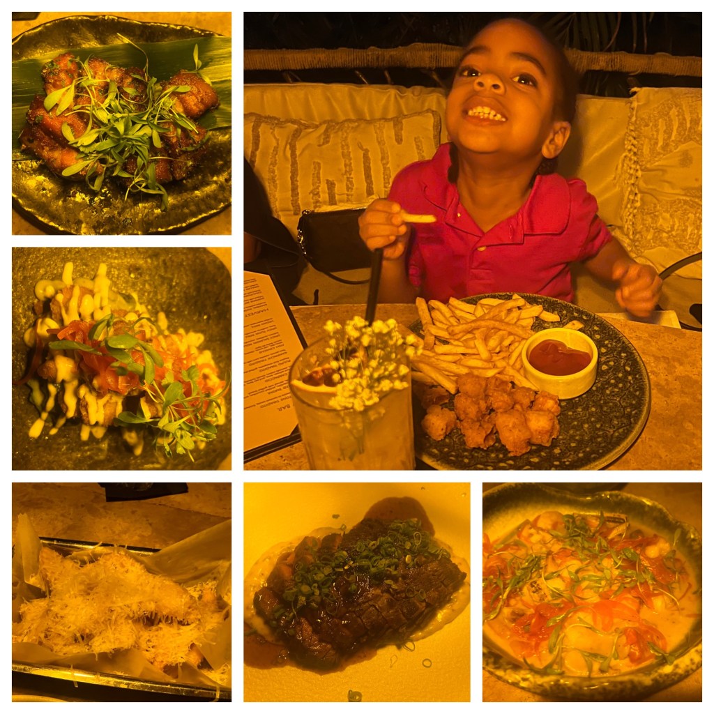 Another restaurant where we had dinner was Brutto, and the experience was interesting from the start – the dining room was surprisingly empty for a weekend night, especially for a spot with locations not only in Panama but also in El Salvador and Aruba. Its sleek, modern vibe still set the tone for a good meal. The menu was extensive, and we kicked things off with the Mai Tai Son, served in the cutest little glass, before tearing into the fresh bread with black truffle butter, which was honestly unforgettable. We followed that with New Zealand mussels bathed in garlic butter with candied potato and tuna tacos filled with red tuna, crispy tortillas, red onion, and mayo‑shiso. For mains, I ordered the Surf & Belly, a mix of red prawns, pork belly bites, pork jus, mushrooms, and greens, plus a creamy risotto on the side because why not! My mom and CJ shared the boneless ribs, slow‑cooked baby backs glazed in gochujang BBQ and served with mayo‑ponzu, butter lettuce, and jasmine rice. We enjoyed the meal, however, it was not one of our favorites while we were there.