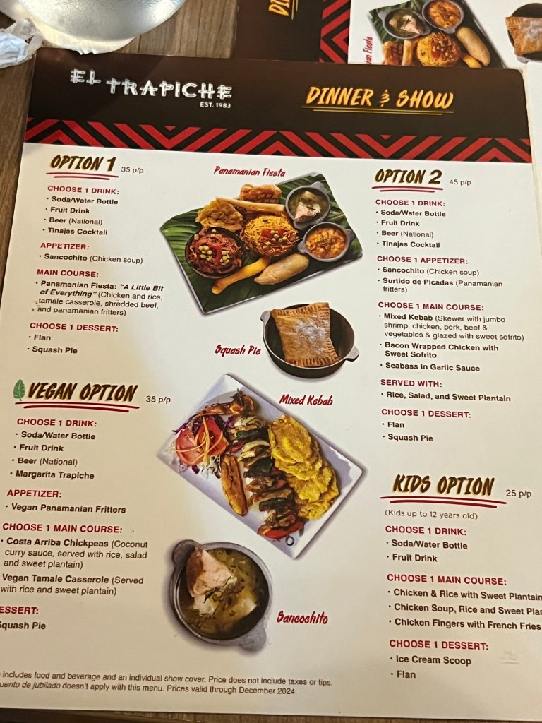 One of the cultural highlights of our time in Panama was a folklore dance and dinner show at El Trapiche, conveniently just a five-minute walk from our hotel. It turned out to be far more than just dinner and entertainment; it was a lively introduction to Panama’s traditions, music, and national pride.