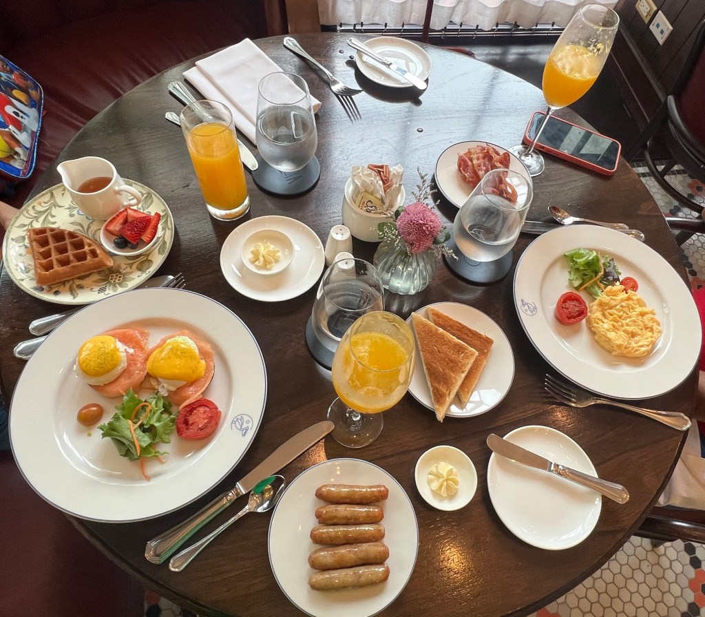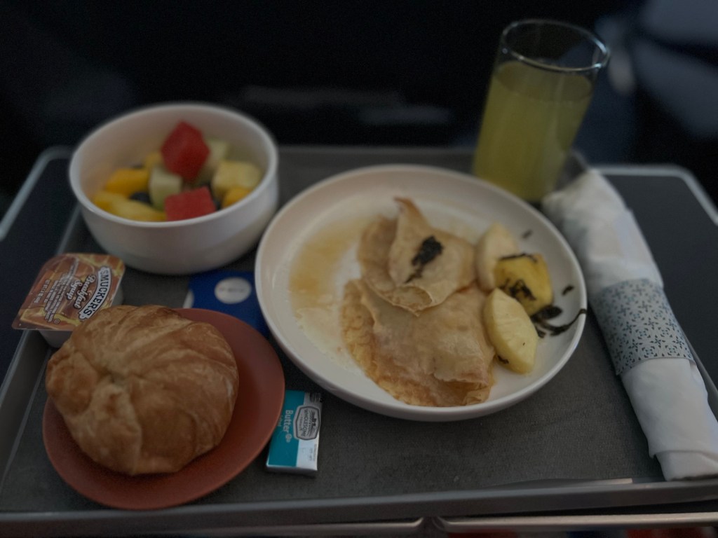 I was already exhausted while we were waiting to board so as soon as we settled into our business class seats, I got comfortable and fell asleep almost immediately. I woke up later for breakfast—pineapple crepes and a mimosa that tasted like it was made with Tang 🤢