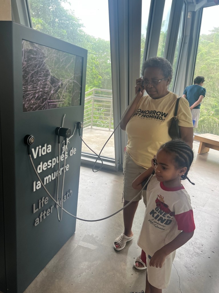 Inside, the museum focuses on Panama’s unique role in shaping global biodiversity. The exhibits explain how the formation of the Isthmus of Panama millions of years ago connected North and South America, allowing plant and animal species to migrate between the continents — a pivotal event known as the Great American Biotic Interchange. The galleries walk you through geology, ecosystems, marine life, and rainforest habitats, with large visuals, immersive rooms, and detailed informational displays.