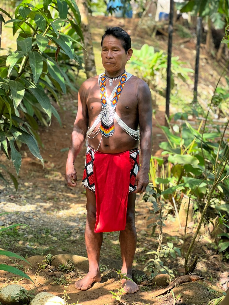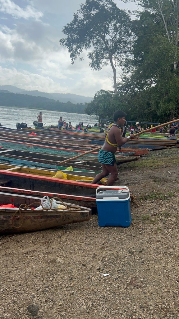 We climbed into a long wooden canoe and traveled upriver for about 30 minutes, gliding through calm water surrounded by dense rainforest. The Emberá are one of Panama’s Indigenous groups, traditionally living along rivers in stilted wooden homes with thatched roofs. When we arrived, we were welcomed into the community and given an introduction to their way of life. We learned how they use local plants for medicine, dyes, food, and construction materials. They showed us inside one of their homes — simple, open-air structures raised above the ground — and even pointed out what they jokingly called their “gym,” demonstrating the physical nature of their daily routines.